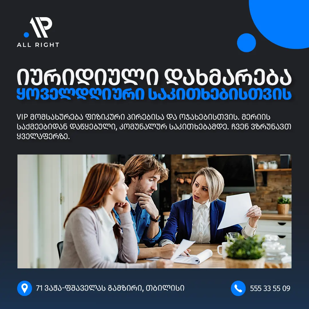 All Right გთავაზობთ პროფესიონალურ იურიდიულ მომსახურებას ფიზიკური და იურიდიული პირებისთვის. ჩვენ ვეხმარებით კლიენტებს სამართლებრივი რისკების შემცირებაში, ხელშეკრულებების სწორად მართვაში და ბიზნესის უსაფრთხო განვითარებაში.