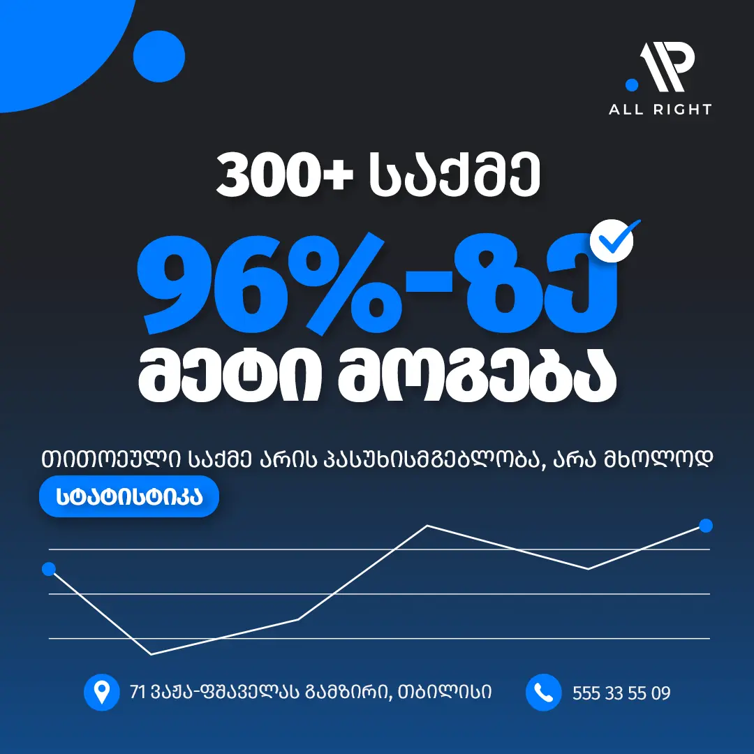 ჩვენი პრაქტიკული გამოცდილება გვაძლევს საშუალებას, ეფექტურად ვმართოთ რთული სამართლებრივი პროცესები. All Right-ის გუნდმა არაერთ შემთხვევაში დაიცვა კლიენტის ინტერესები და თავიდან აარიდა მას სერიოზული ფინანსური და სამართლებრივი ზიანი.