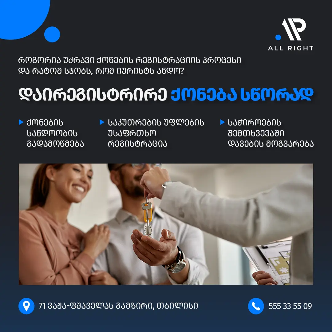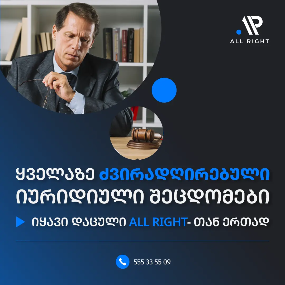All Right გთავაზობთ პროფესიონალურ იურიდიულ მომსახურებას ფიზიკური და იურიდიული პირებისთვის. ჩვენ ვეხმარებით კლიენტებს სამართლებრივი რისკების შემცირებაში, ხელშეკრულებების სწორად მართვაში და ბიზნესის უსაფრთხო განვითარებაში.